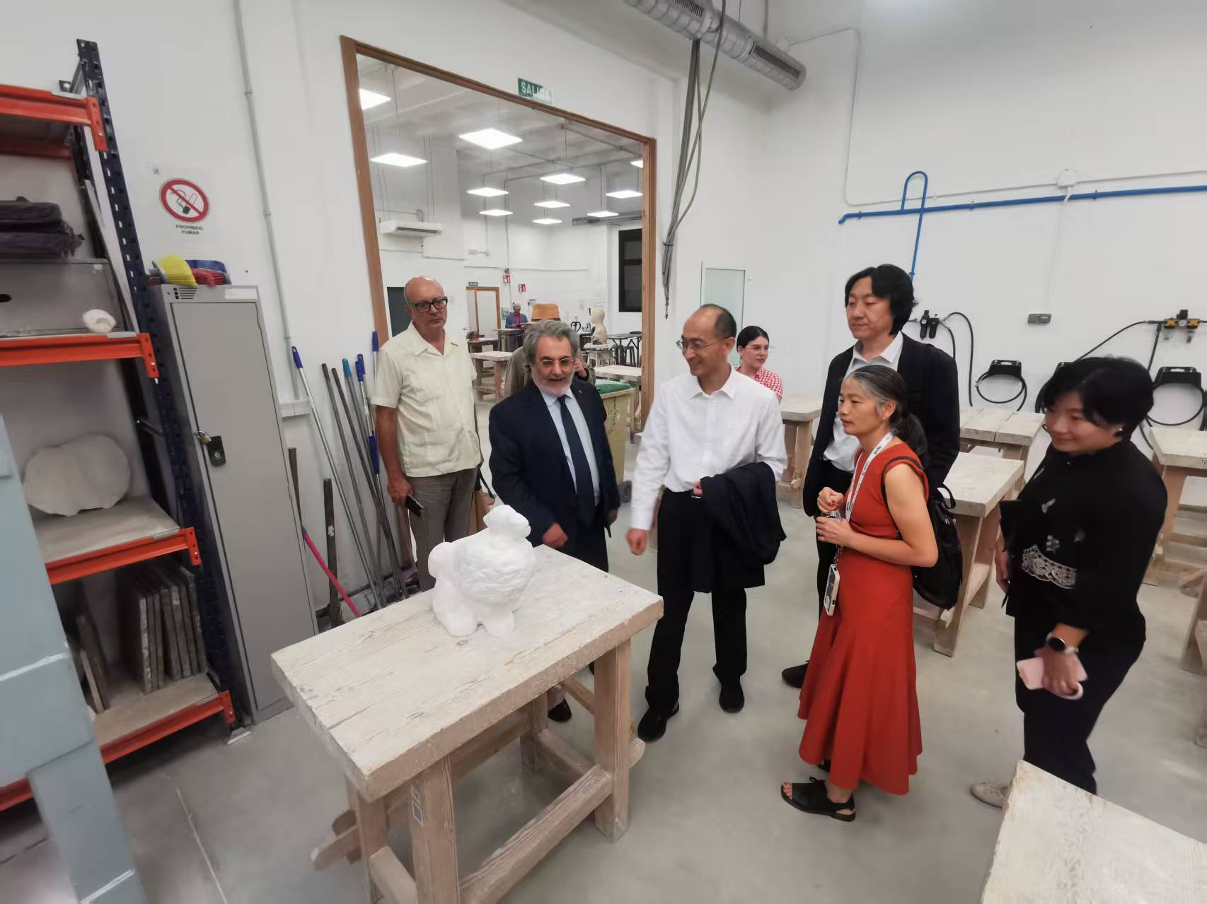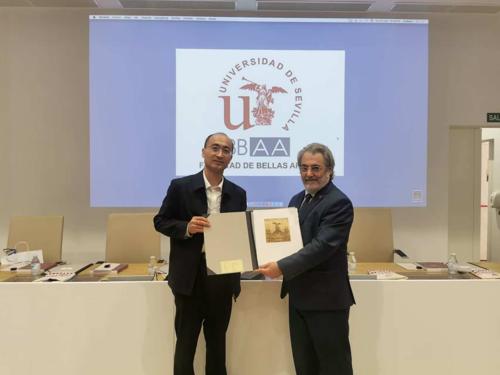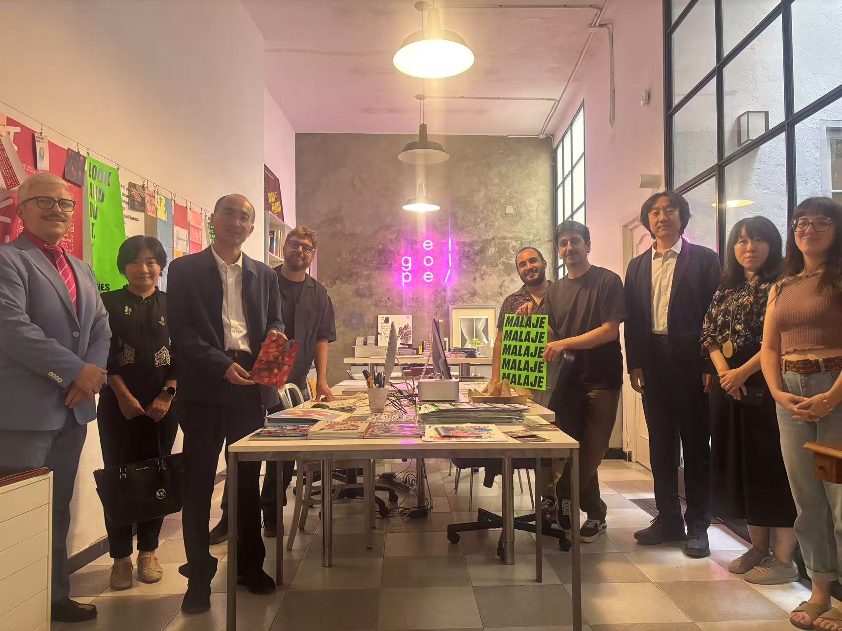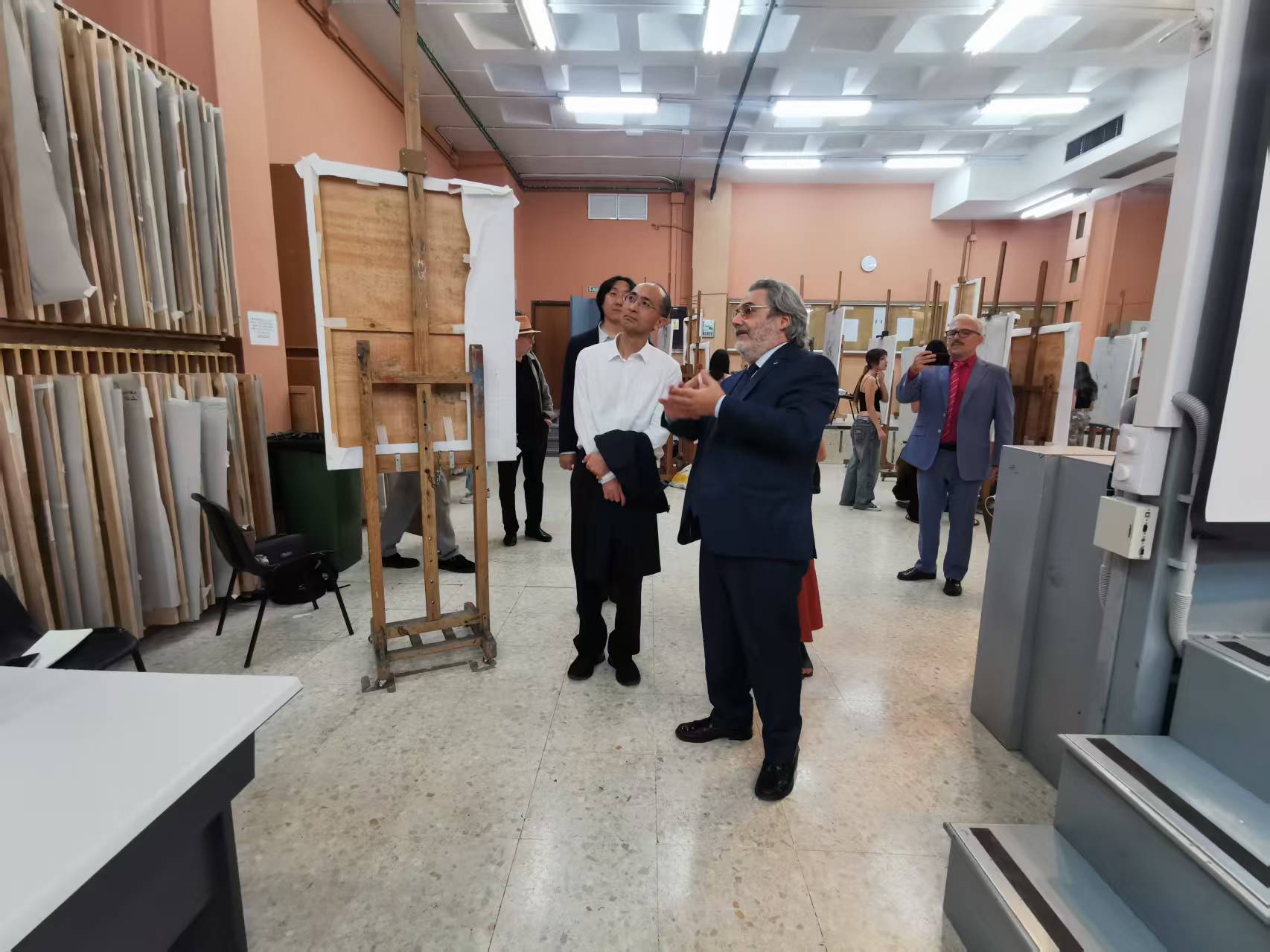 在塞维利亚大学(University of Seville)访问期间,美术学院院长比尔宝·佩尼亚(Bilbao Peña)、副院长曼塞拉·马丁内斯(Mancera Martínez)、库尔特·格勒奇(Kurt Grötsch)教授对代表团表示热烈欢迎,代表团现场观摩了课程教学、师生实践等以及学院在文物修复等领域的成果。在座谈中双方介绍各自在教育教学、科研创新、文化交流方面的成果,就多学科合作展开磋商,并在师生互访、联合培养、学术资源共享、联合科研项目申报等领域达成共识,正式签署合作备忘录,并明确了欧盟ERASMUS交流项目的进程与后续推进。随后,代表团还访问西班牙知名设计机构El Golpe,双方就设计产业创新发展、设计人才联合培养、跨国设计项目合作等议题深入交流,为设计领域对接国际资源、推动产业升级探索新路径。